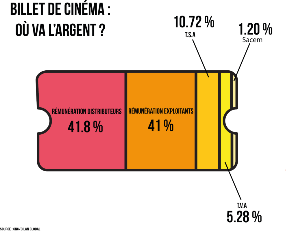 Enfin, les entrées en salle constituent une autre source pour les aides à la création, via la taxe supérieure additionnelle (TSA) qui représente 10.7% du prix du billet, entièrement reversés au CNC. À titre indicatif, le prix moyen d’un ticket en France (il s’en est vendu près de 180 millions) est évalué à 7.24€, dont 80 centimes de TSA. Du reste, les exploitants de salles (Pathé, UGC, Cinémas Lumières…) et les distributeurs (Paramount, Europa Corp, Les films du losange…) se partagent 82.3% ; la SACEM prélève 1.2% et la TVA à taux réduit est fixée à 5.2%.